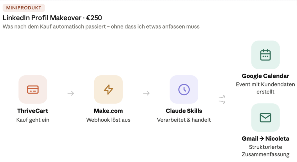 „Ich verkaufe ein LinkedIn Profil Makeover über ThriveCart. Nach jedem Kauf löst Make.com einen Webhook aus. Ich möchte, dass Claude automatisch ein Kalender-Event erstellt und mir eine strukturierte Zusammenfassung per Gmail schickt.“